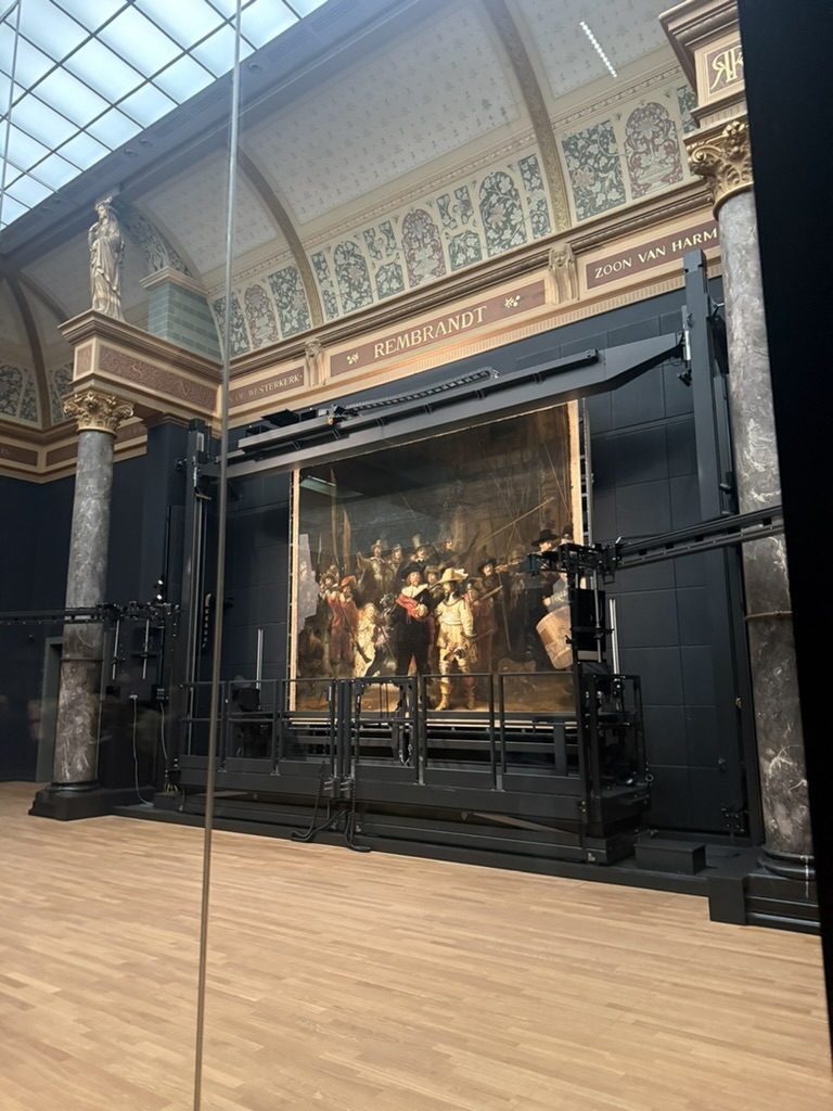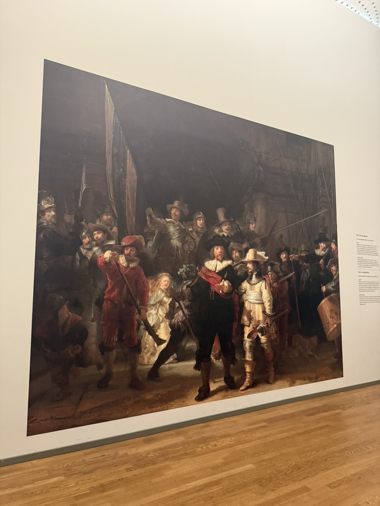 이 작품의 이름은 “The Night Watch” 이고, 해석하면 ‘야경’ 이라는 뜻을 담고 있다. 원래는 밝은 대낮에 행진을 준비하는 장면을 묘사한 그림이였으나, 강한 명암대비와 오랜 시간이 지나면서 그림 표면에 생긴 유약 때문에 더 어둡게 보였고, 그로 인해 후에 “야경”이라는 이름이 붙여졌다. 렘브란트가 암스테르담의 시민 방위대를 그린 작품이고, 렘브란트의 뛰어난 빛과 그림자 표현, 인물들의 역동적인 모습과 더불어 당시 사회상을 담고 있어 명작으로 평가받고 있다. 당시 암스테르담 시민 방위대는 실제로 문을 지키고, 치안과 화재 대응 등의 공공서비스도 담당했다. 그러나 전투보다는 시민 보호와 의식 활동 중심이였다고 한다. 사실 위에 보이는 사진은 원래 작품의 복사본이고, 실제 작품은 지금 복구 작업 중에 있다.