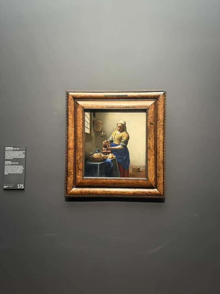 이 그림은 진주 귀걸이를 한 소녀를 그린 걸로도 유명한 요하네스 페이메이르가 그린 유화 작품 중 하나인 “the milkmaid” 이다. 베르메르는 렘브란트와 더불어 네덜란드의 ‘황금시대’를 대표하는 화가인 만큼, 일상생활의 모습을 담은 풍속화들로 명성을 얻었다. 특히 그는 빛의 표현, 그리고 색채의 조화에 탁월했는데, 파란색과 노란색을 조화롭게 사용하는 그의 특유의 색감 감각은 이 작품에서도 돋보인다. 이 그림에서 여인은 노란색 상의에 파란 앞치마를 두르고, 굴곡 없이 단단한 빛을 받아 마치 조각처럼 화면에 고요하게 자리 잡고 있다. 이는 ‘진주 귀걸이를 한 소녀’ 에서도 볼 수 있는 특징으로, 두 작품 모두 페이메이르가 파란색과 노란색을 얼마나 조화롭고 깊이 있게 다뤘는지를 잘 보여준다.
